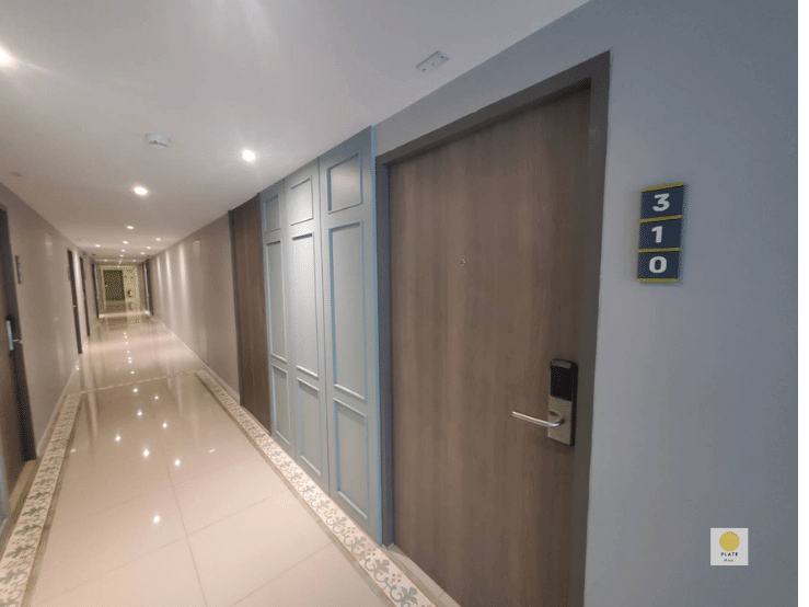 ▼飯店走廊簡單、明亮,鋪磁磚的走道拉行李或是嬰兒車都比較好推