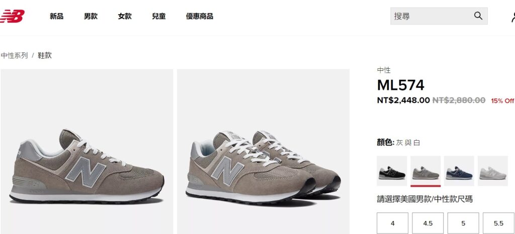 這裡的NB不會像adidas出很多零碼或是過季款式。大致上的基本款都有,以我買的ML574為例官網打85折後2448元,我在這裡買11068,匯率0.23計算是2434元。