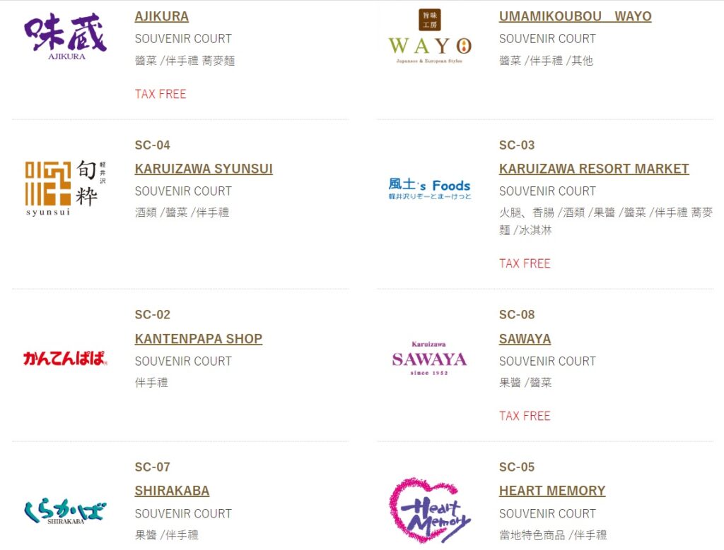 輕井澤購物中心分為10個區域-1.味之街 2.美食廣場 3.NEW WEST 4.WEST 5.土產店(輕井澤特產伴手禮) 6.TREE MALL 7.CENTER MALL 8.GARDEN MALL 9.NEW EAST 10.EAST。