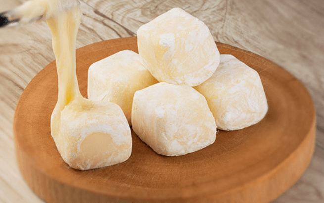 吃過像年糕一樣可以拉長的起司嗎? わらく堂有一款可以拉長到23cm的起司Omochizu ,冷凍後的口感就像麻糬冰淇淋, 濃郁的起司香味和QQ的口感,非常特別。